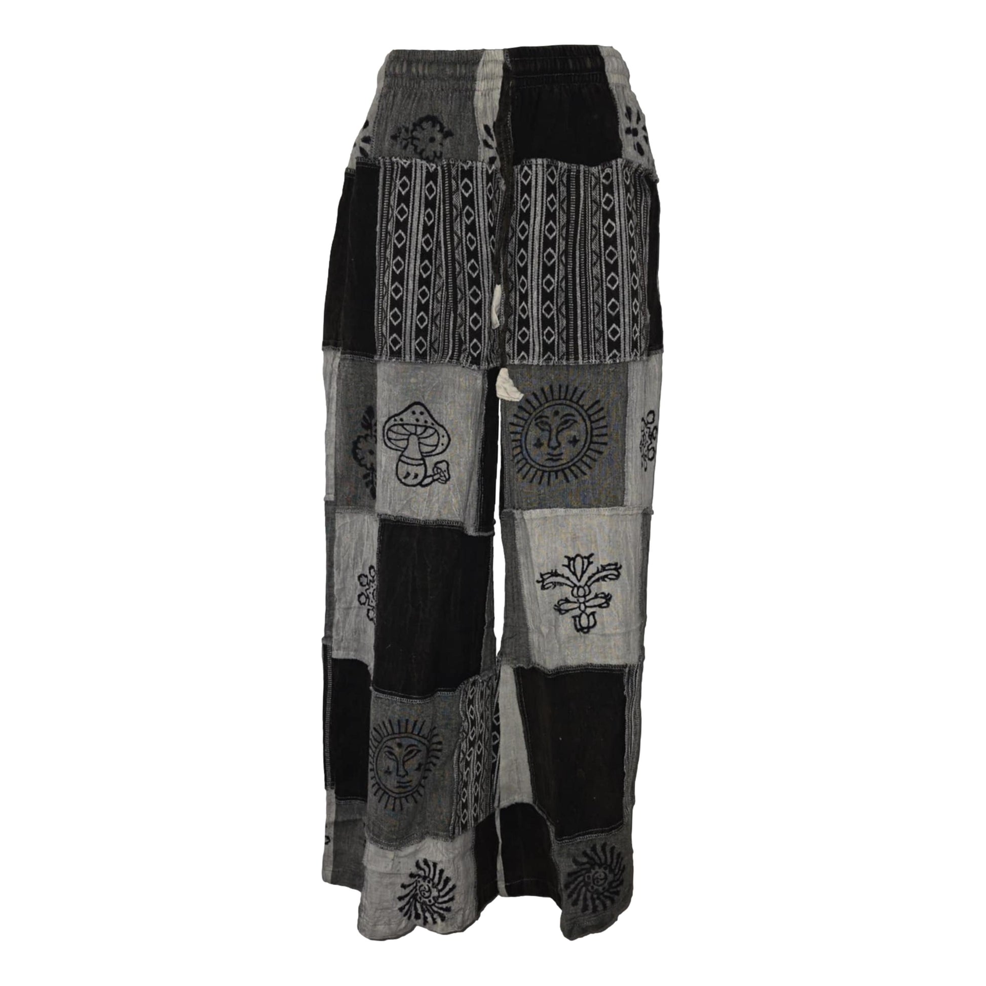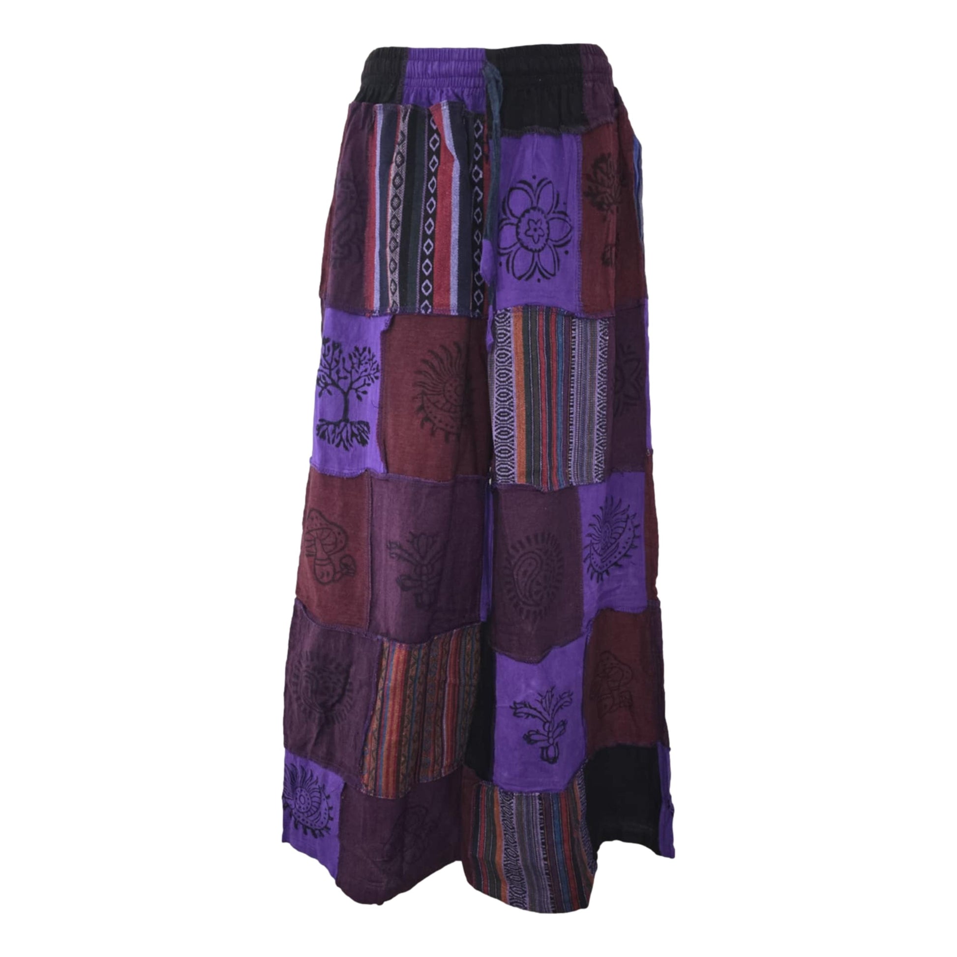 These wide leg pants are made in Nepal and feature a block print patchwork design. The elastic and drawstring waist provide comfort and convenience, while the side pocket adds practicality.