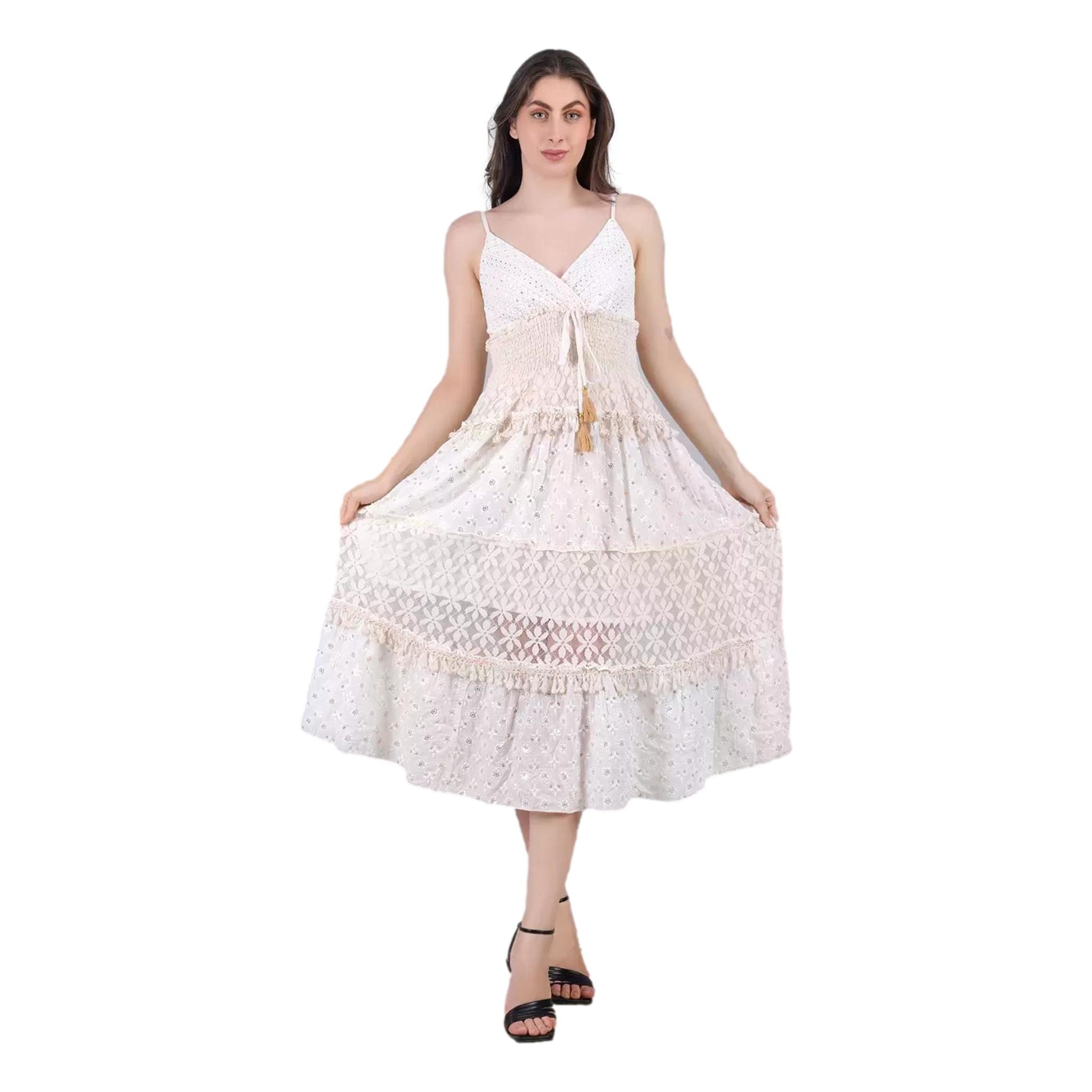 This dazzling dress shines with elegant thread, lace and gold sequin accents that add just the right sparkle. Shirred elastic back. Its playful layered design flows effortlessly, making it perfect for everything from glamorous parties to stylish daytime outings. Made from 100% Rayon. For comfort and flair, it features adjustable spaghetti straps and an elastic under bust with lining, creating a fun and timeless addition to your wardrobe.