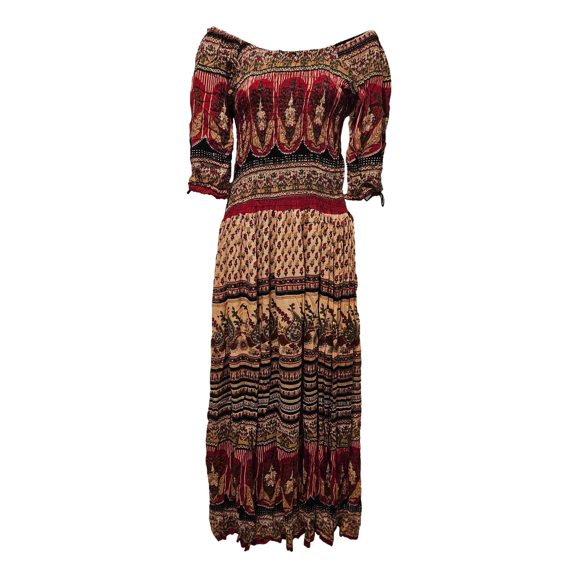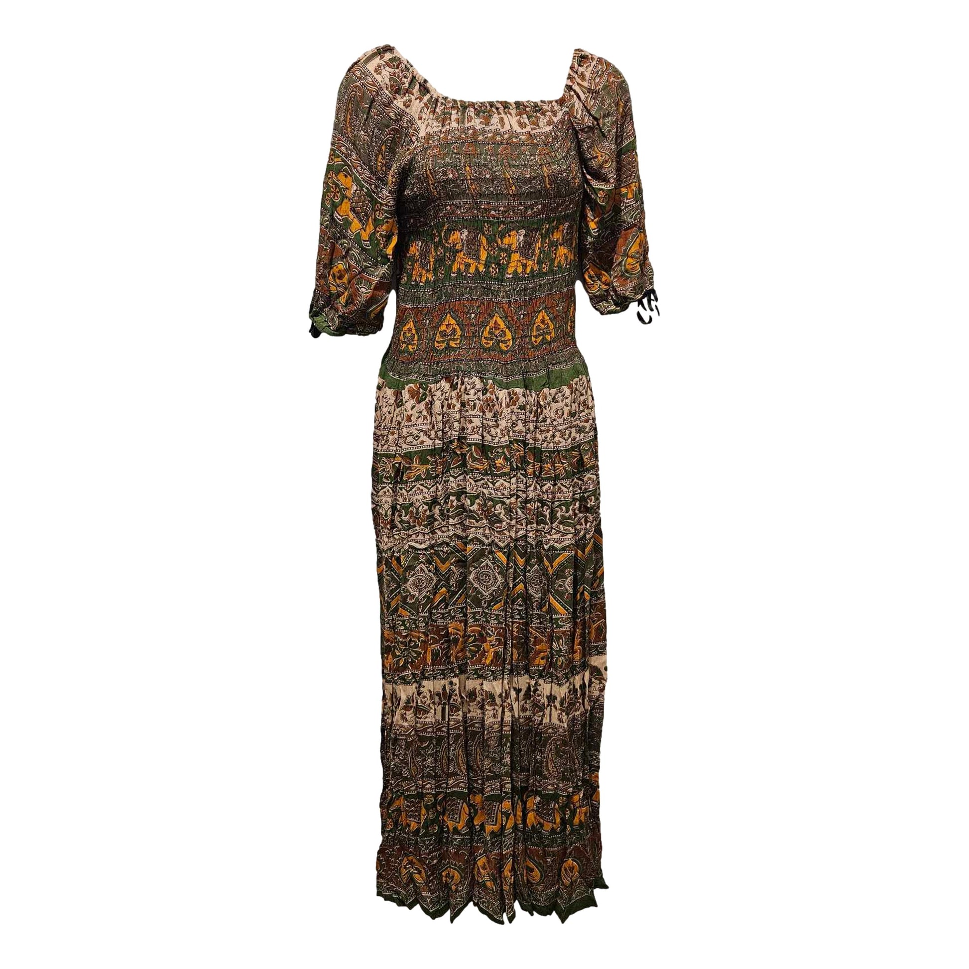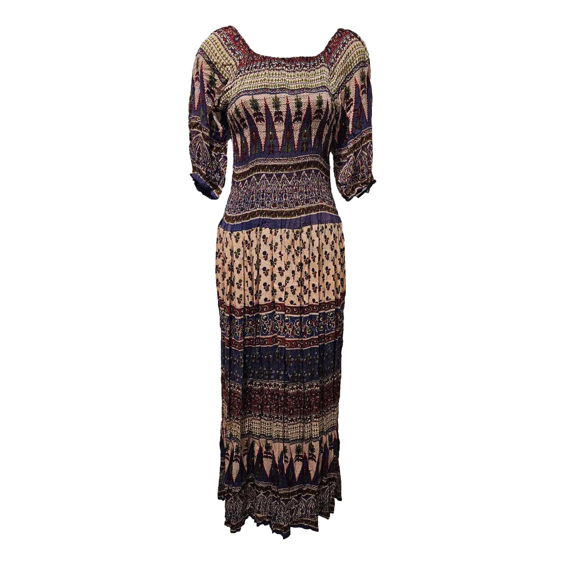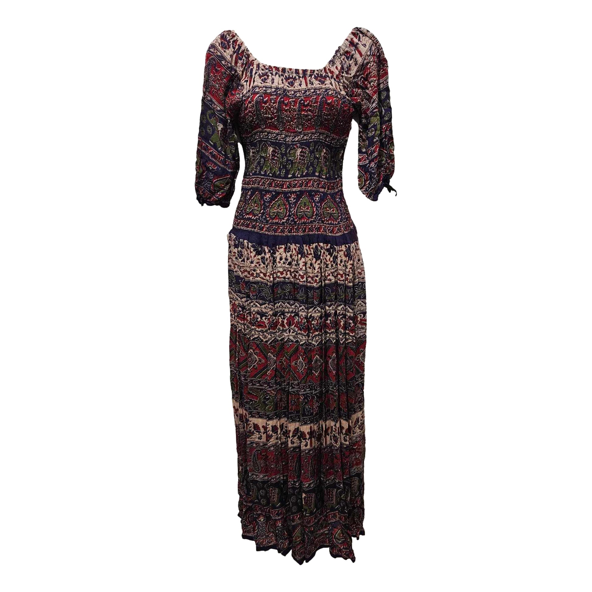 This Boho Indian Dress features a shirred bust for added comfort and can be styled to be worn on or off the shoulders. It can easily be dressed up with a belt or worn casually.