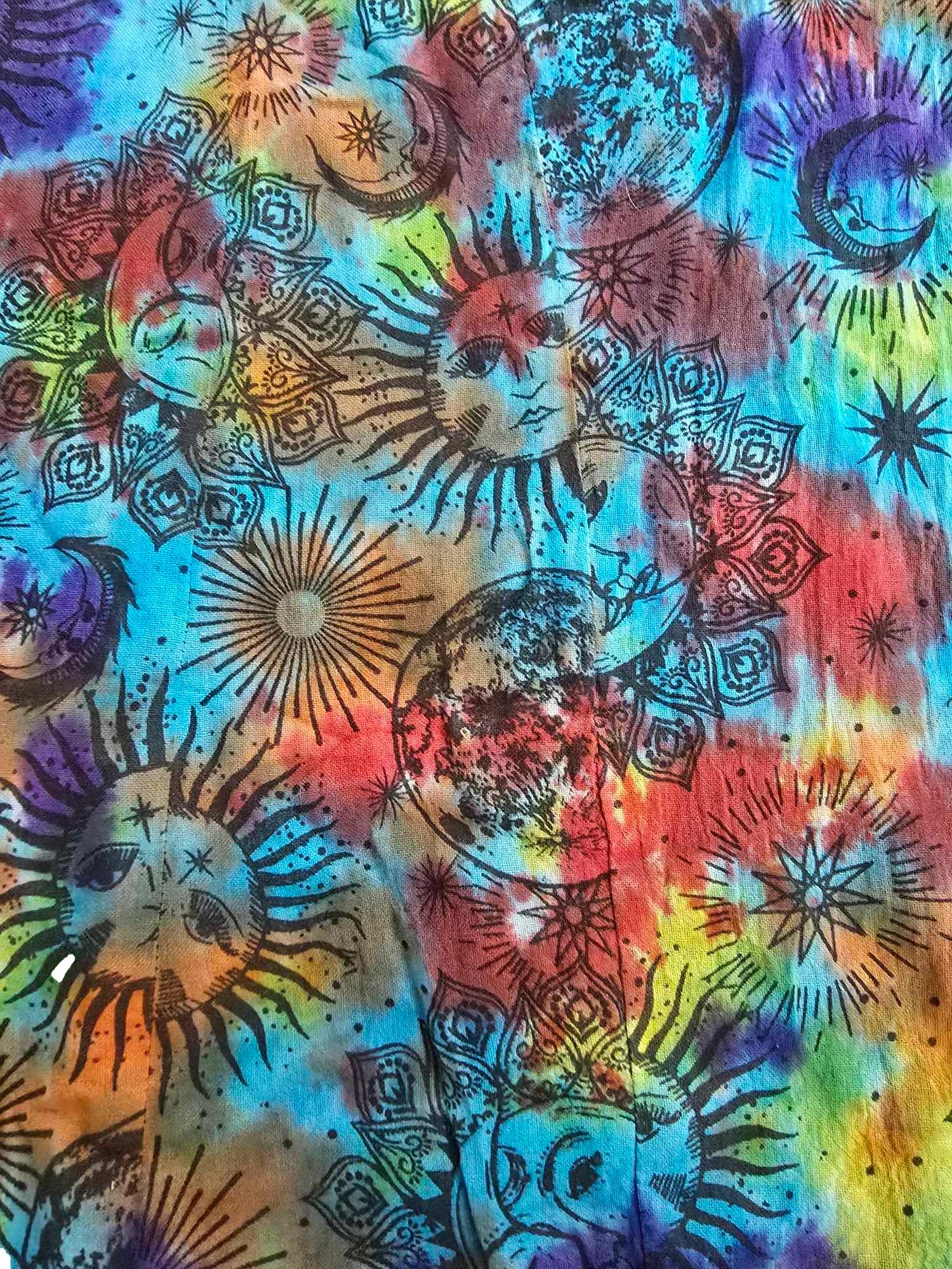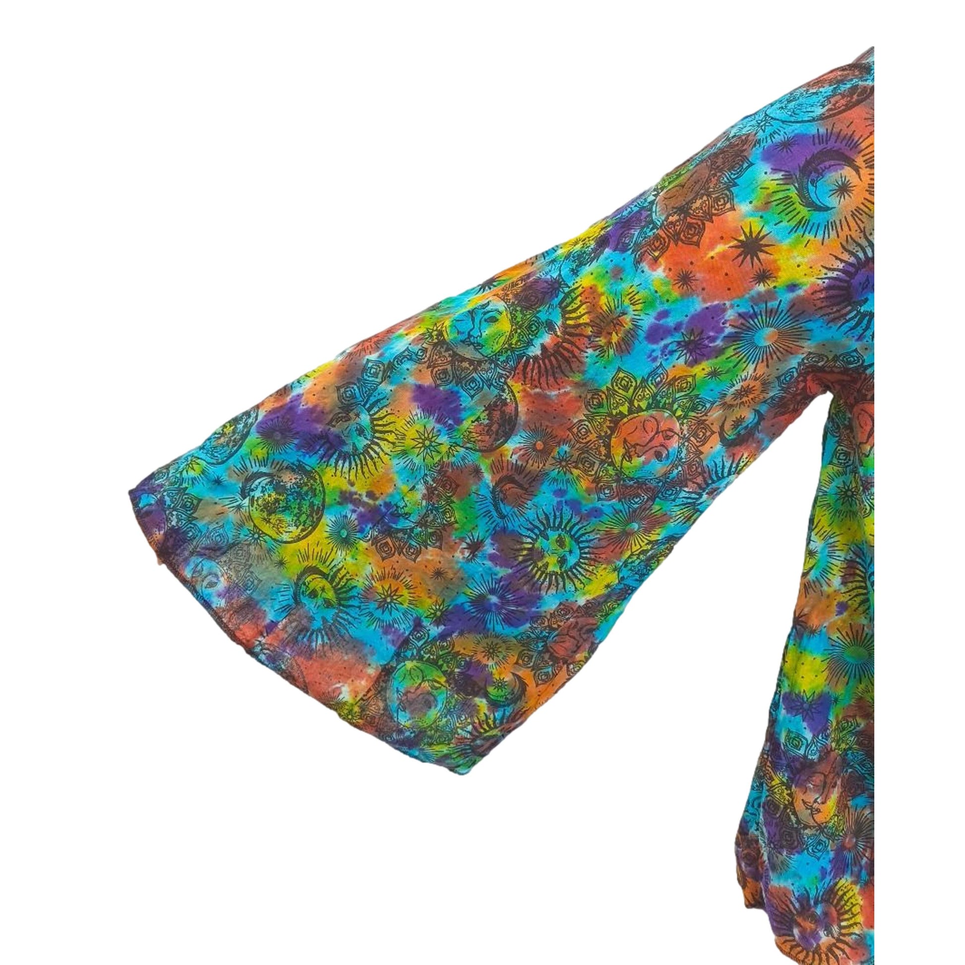 These free-size, high-waisted pants feature a stunning cotton rainbow tie-dye celestial print. Handcrafted in Nepal, they offer a comfortable fit with an elasticized back waist. See images for details.