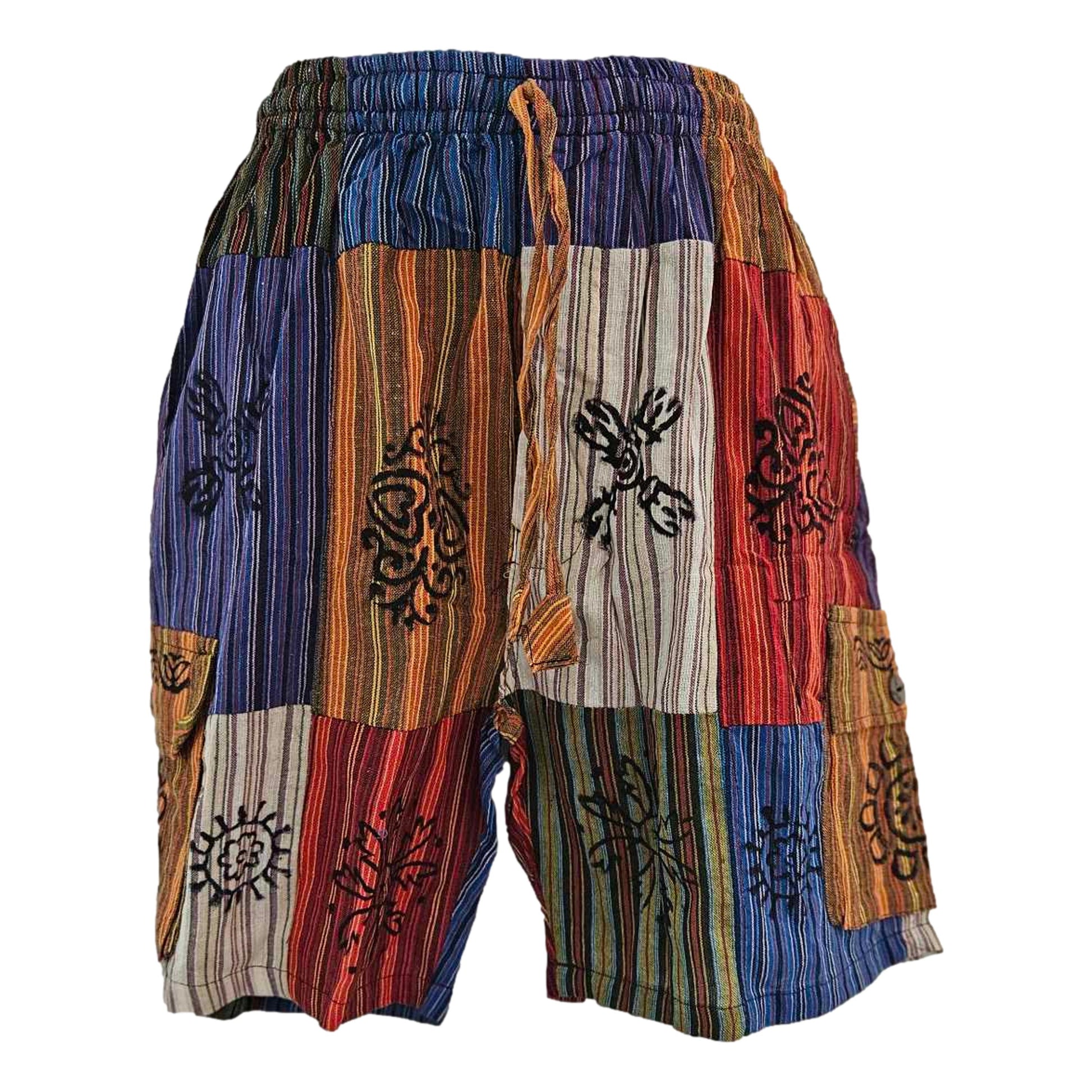These Cotton Patchwork Shorts feature an elastic waist and drawstring for a comfortable fit. They also include two slash pockets, two cargo pockets, and a back pocket for convenient storage. Please note that prints and colours may vary.
