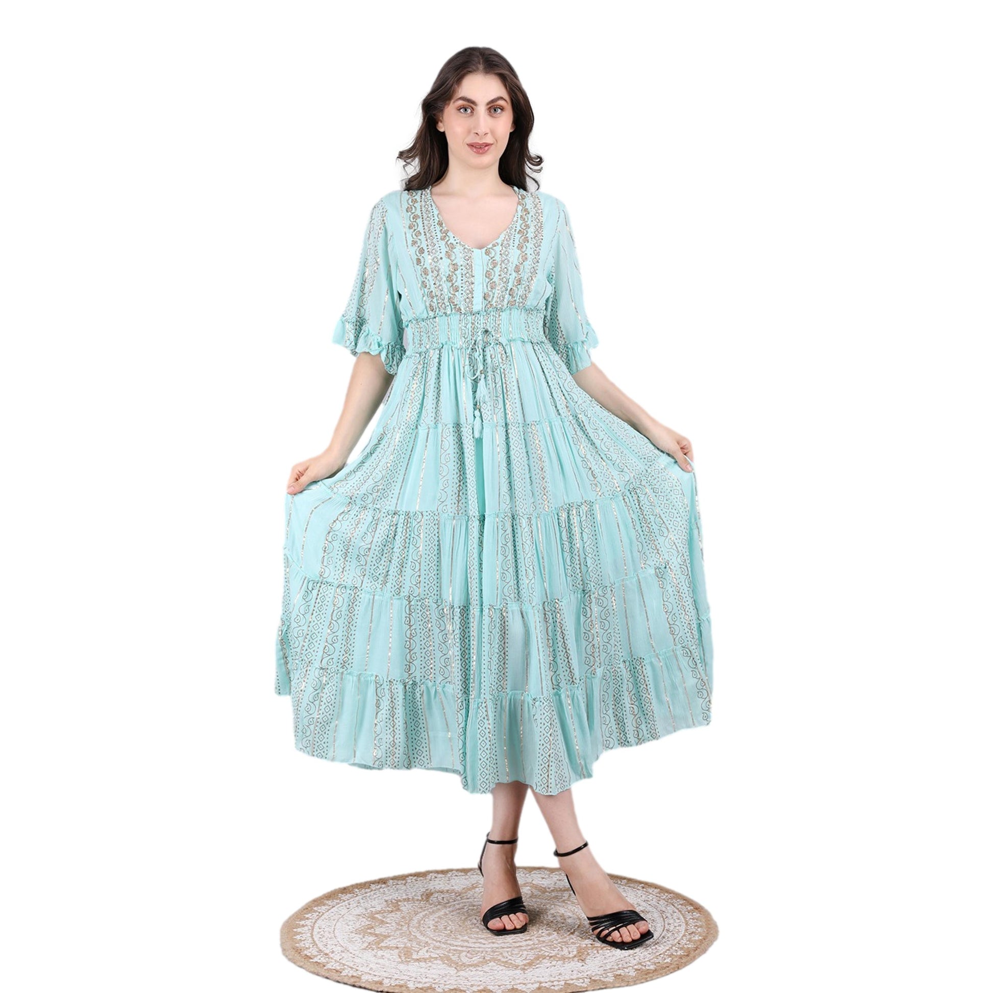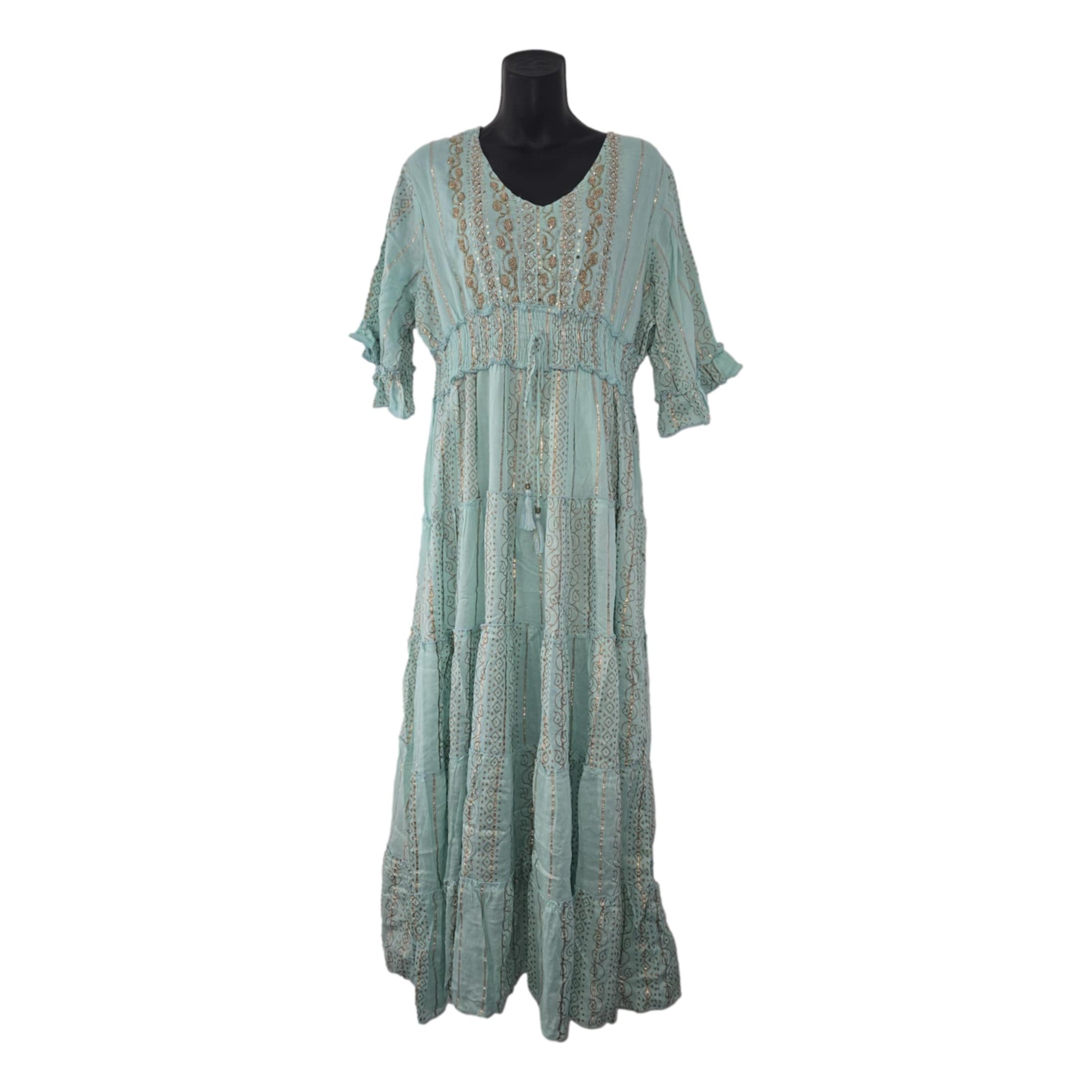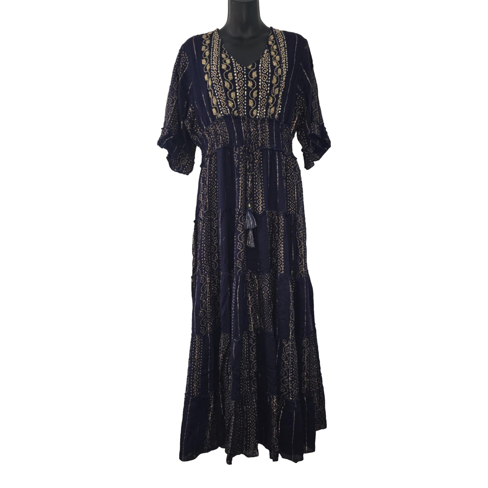 Enhance your wardrobe with our Embroidered Boho Maxi Dress. Made from lightweight, breathable fabric and boasting a beautiful silhouette, this dress is perfect for any occasion. With a lined top body and half of the skirt, along with a V-neck and lace-up tie around the elastic stretch waist and tassel detail, this dress offers both comfort and style. Slip it on, add some strappy heels and statement earrings, and get ready to make a statement. Crafted from 100% viscose.