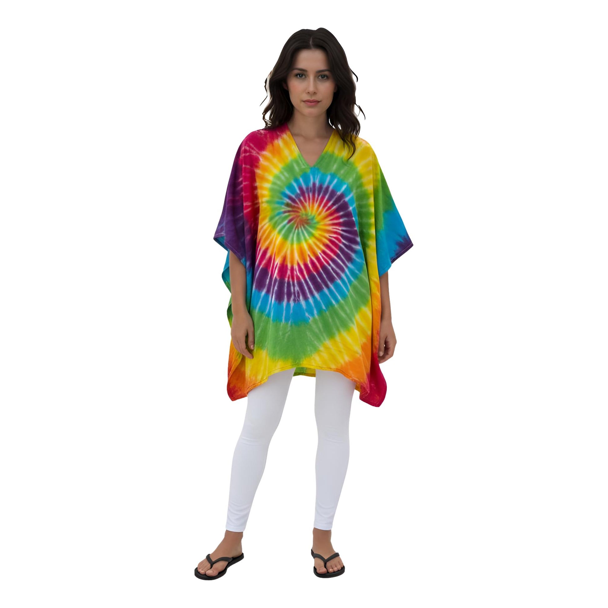 This kaftan is made from a lightweight fabric and features a flowy design with vibrant rainbow tie dye.