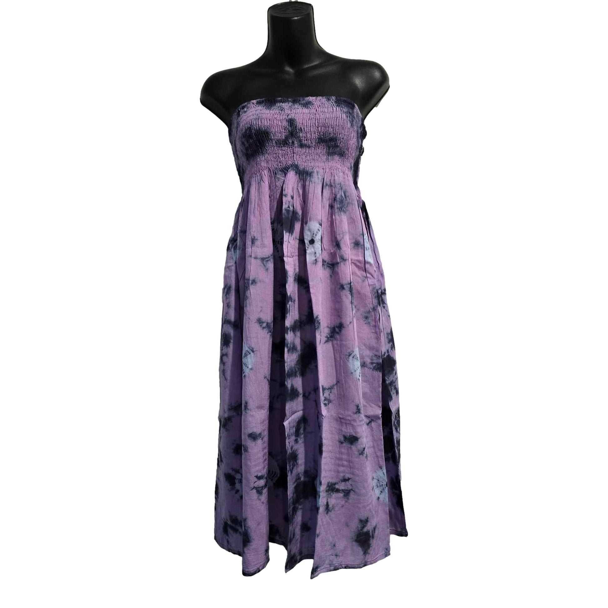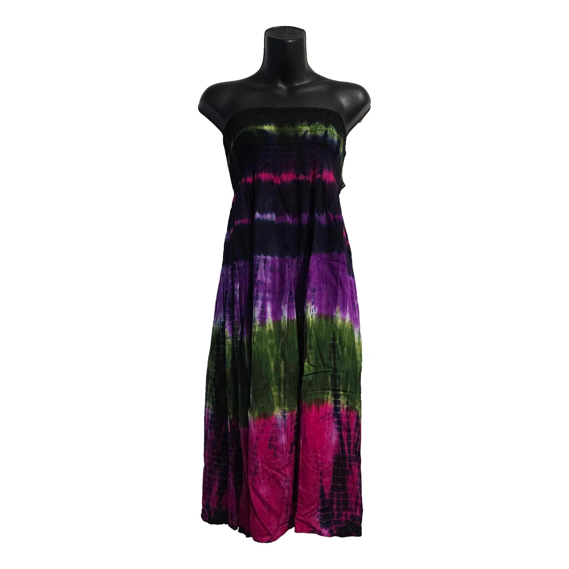 Versatile Tie Dye Dress can be worn as a dress or a shirt, featuring a shirred bust or waist for added comfort .